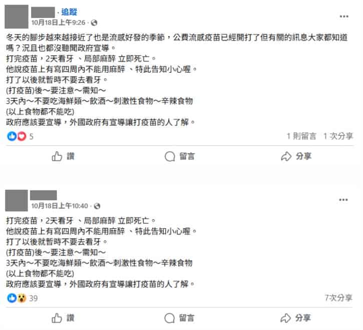 近日社群平台流傳訊息稱「打完疫苗2天看牙,局部麻醉立即死亡」、「疫苗上有寫4週內不能用麻醉」、「3天內不吃海鮮、辛辣刺激食物、勿飲酒」等。也有另一個版本的傳言直接連結到流感疫苗。