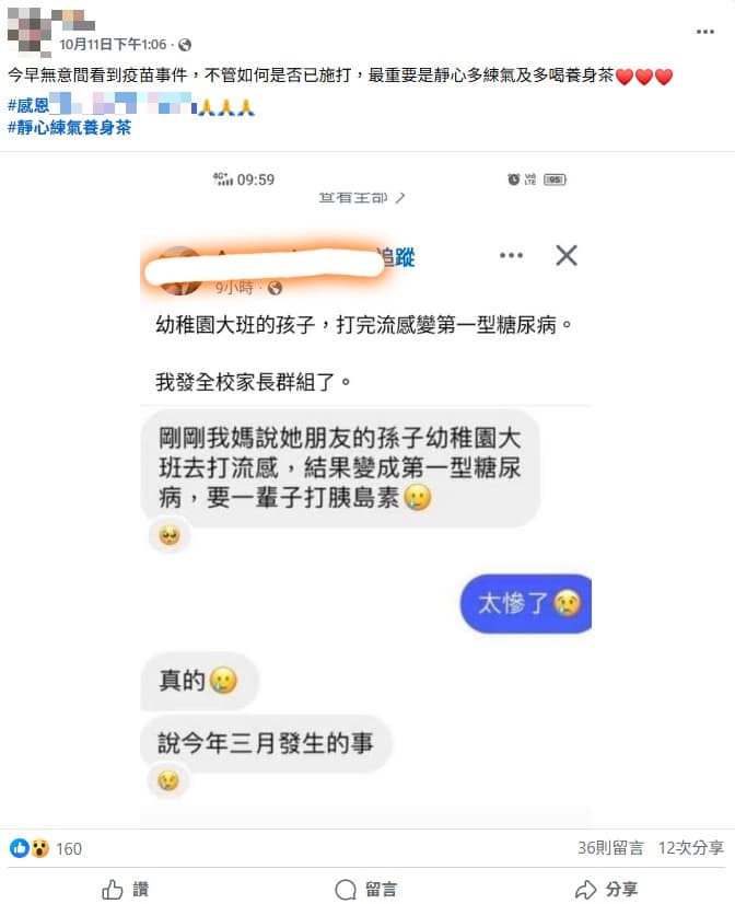 今年10月1日起公費流感疫苗開打,隨後社群平台流傳訊息稱有幼兒打完流感疫苗後變成第一型糖尿病,須終生施打胰島素。