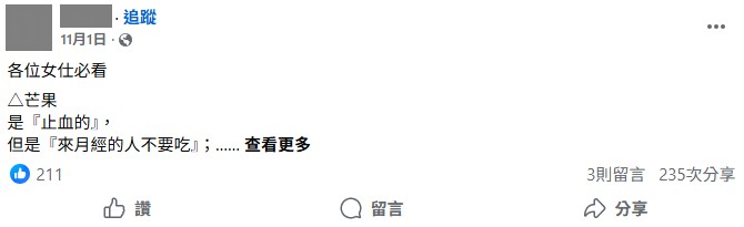 近期社群平台流傳一篇蔬果養生禁忌文章,其內容詳述多種蔬果飲食宜忌,例如月經來的時候不能吃芒果、失眠不能吃山藥、小孩不能吃韭菜、吃龍眼會嗜睡、癌症患者不能吃冬筍及紫菜等;文中也提到番茄與大蒜可抗癌、用黑木耳取代阿斯匹靈及螺旋藻的神奇療效;文章最末則聲稱睡眠及開窗時間均有國際規定、上午6-9時致癌風險最高、早上去樹林運動可能會因二氧化碳致癌等。