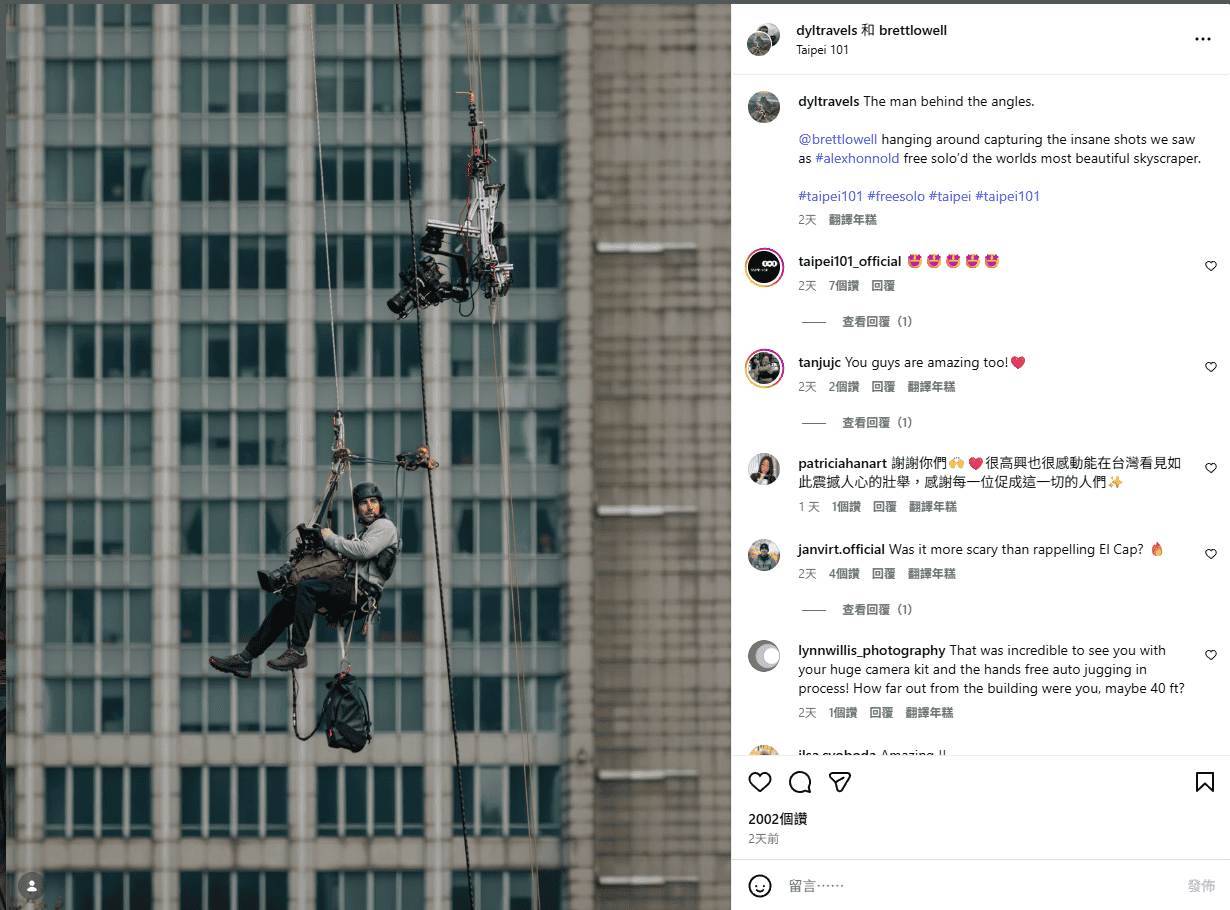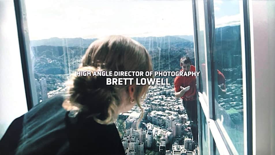 三、霍諾德先前曾揭露此次101紀錄片高空攝影,稱攝影團隊都是他的朋友,高空攝影指導Brett Lowell有個很瘋狂的大裝備,他基本上是在幾百英呎高的建築物外戴著一條固定繩索(static line),拿著這個無敵廣角鏡頭,就像飄在太空中。