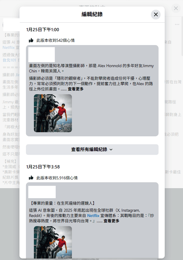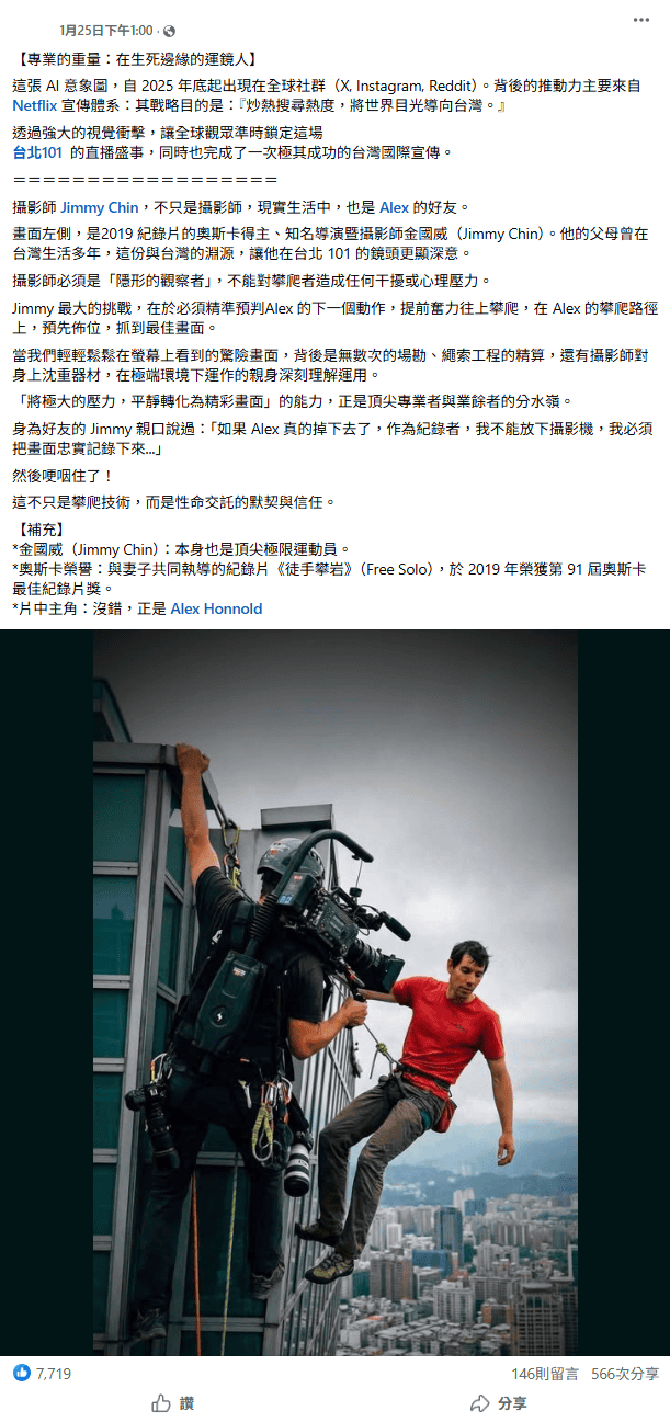 一、網傳文章的原始發布者1月25日發布一張AI影像搭配文字,宣稱此次霍諾德攀登101紀錄片的攝影師是金國威,但後續遭影評人翁煌德查核,金國威並未參與此次101紀錄片攝影,且金國威是華裔美國人,也非網傳文章宣稱的韓裔美國人。