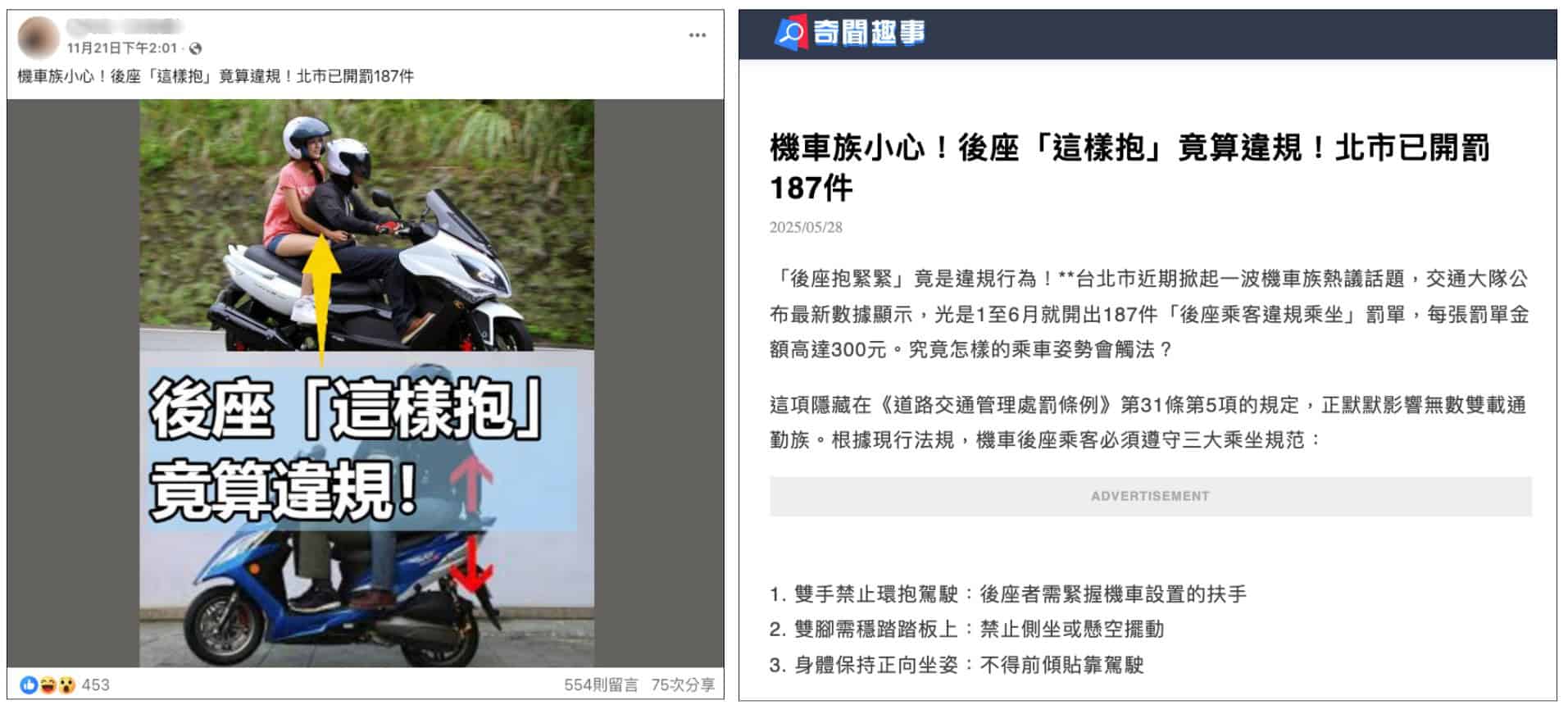 一、台北市交通大隊指出,交通法規沒有明文規定「機車後座乘客環抱駕駛」違法,北市沒有開出187張罰單,傳言說法並不正確。