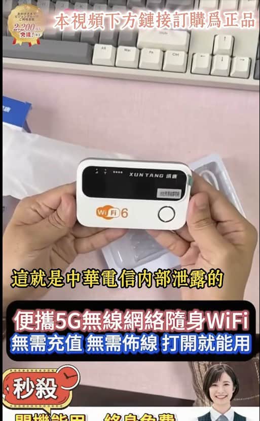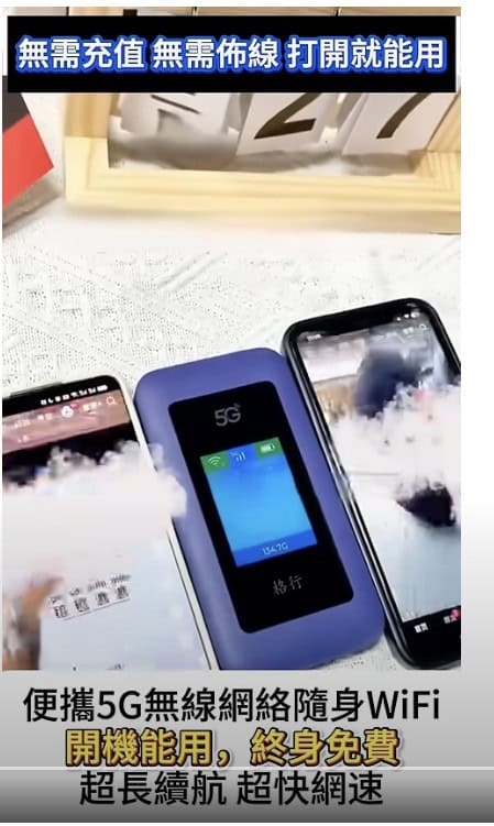 近期網路流傳影片推銷「無需充值、無需佈線,打開就能用」的「便攜5G無線網路隨身Wi-Fi」,宣稱以最新的微波訊號捕捉技術,直接攔截空間中的5G遊離訊號,轉化成超高速Wi-Fi,且不用月繳、不用綁約,只要1099台幣,就可以「買斷下半輩子的網路自由」。影片上傳3週,累積點擊已超過百萬。