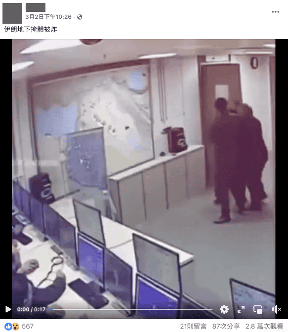 二、傳言共由4個片段組成,其中1個畫面是伊朗國營媒體公布「士兵收到空襲警報但仍堅守崗位」的影像,其餘畫面均出現違反常理的破綻,如:櫃子與牆上的地圖裝潢融合、人物手掌卡在電腦主機上、後方人員仍站著無逃生跡象。