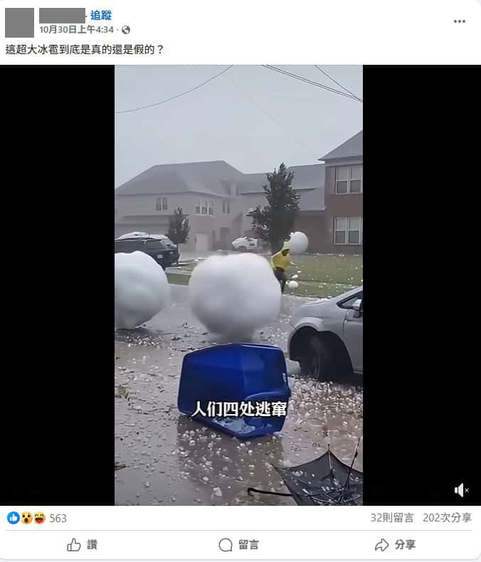 近期,社群媒體上流傳一段影片聲稱美國堪薩斯在10月發生冰雹災害。影片中,許多尺寸不一的冰雹從天而降,有些大如籃球,部份冰雹高度更是與路邊停放汽車的車頂一樣高,且砸落在屋頂時如同球般彈跳、再滾向路邊,造成房屋屋瓦及汽車玻璃被砸毀等災難性景象。