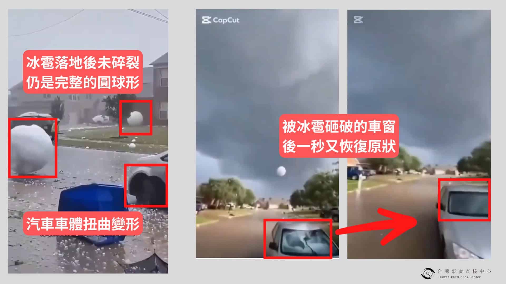 一、網傳冰雹影片有許多破綻,例如巨型冰雹落地後仍維持完整球狀並未碎裂、汽車外觀不自然扭曲變形、被砸碎的車窗玻璃一秒後又恢復原狀等,因此,可合理懷疑為AI生成的虛假影像。