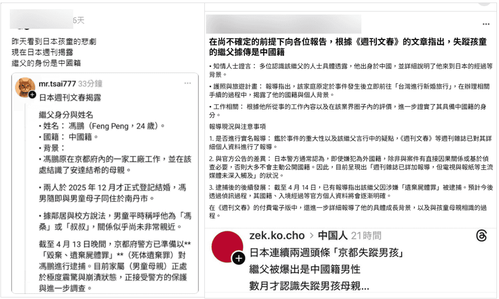 同時間台灣社群流傳訊息,聲稱日本媒體《週刊文春》已經揭露男童繼父為中國籍,也有台灣媒體報導雷同內容。