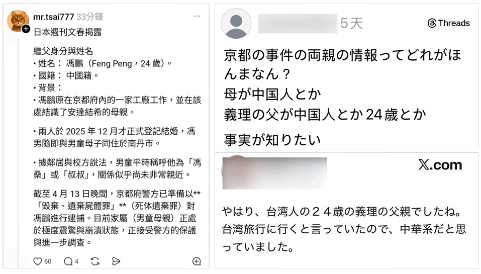 其中Threads帳號「mr.tsai777」貼文獲得大量轉傳,內容稱《週刊文春》揭露嫌犯是中國人,姓名為馮鵬。事後證明全為錯誤訊息,目前該帳號已經關閉。