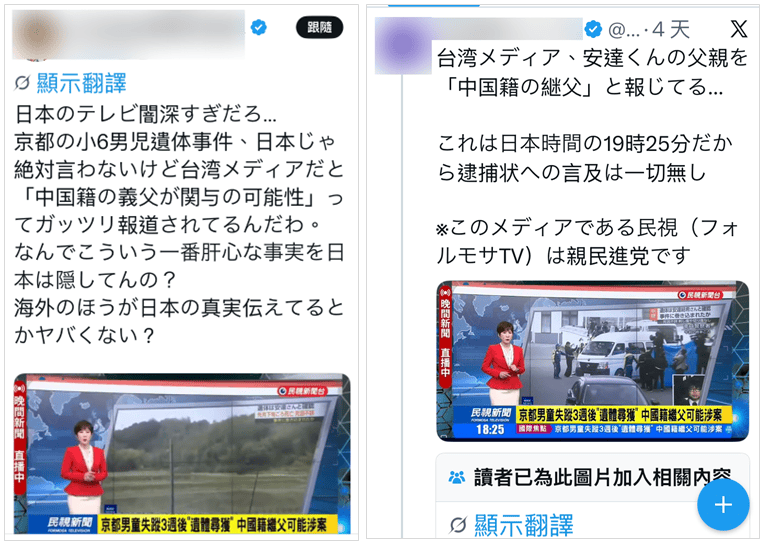 民視錯誤報導轉貼到日本社群,讓假訊息更為擴大。目前民視已下架報導。