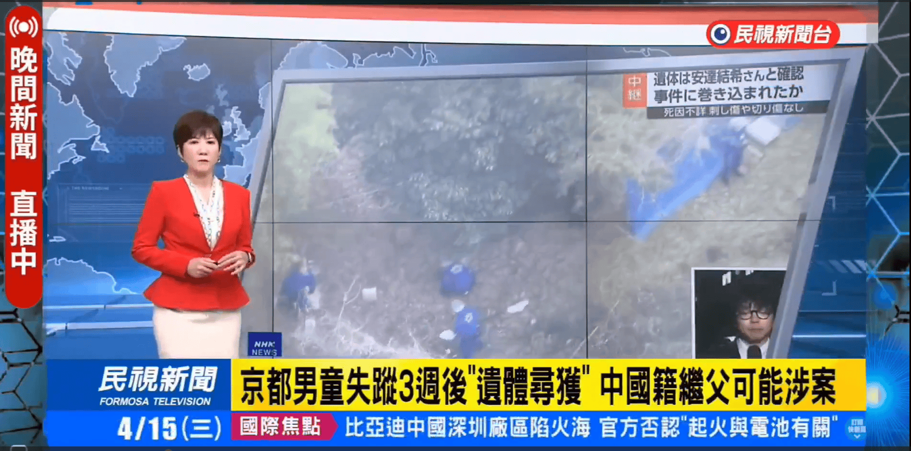 一、京都府南丹市11歲男童3月底失蹤,4月13日遺體在山區發現。繼父供稱殺害男童並棄屍,4月16日遭日本警方逮捕。警方表示,嫌犯為37歲日本人,不是網傳外國籍身分。