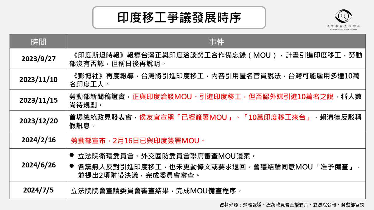 也就是說,在12月總統政見會之前,政府已承認洽簽MOU、規劃印度移工來台,不管官方或賴清德都沒有否認要引進印度移工。