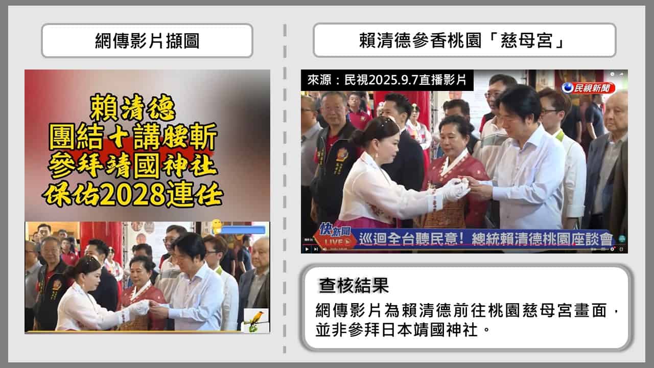 一、9月7日總統賴清德前往桃園慈母宮參香,且有多家媒體報導。網傳影片擷取民視直播畫面,並添加「參拜靖國神社」等不實訊息。