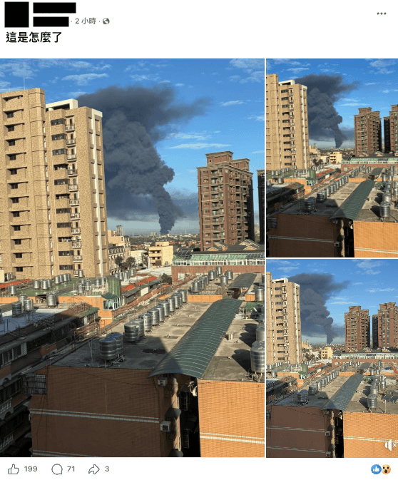 查核中心接獲讀者申訴,4月2日上午9時,臉書社團「桃園大小事」流傳兩張照片、一段影片,畫面內容為遠處飄出黑色濃煙的影像,並搭配文字「這是怎麼了」。