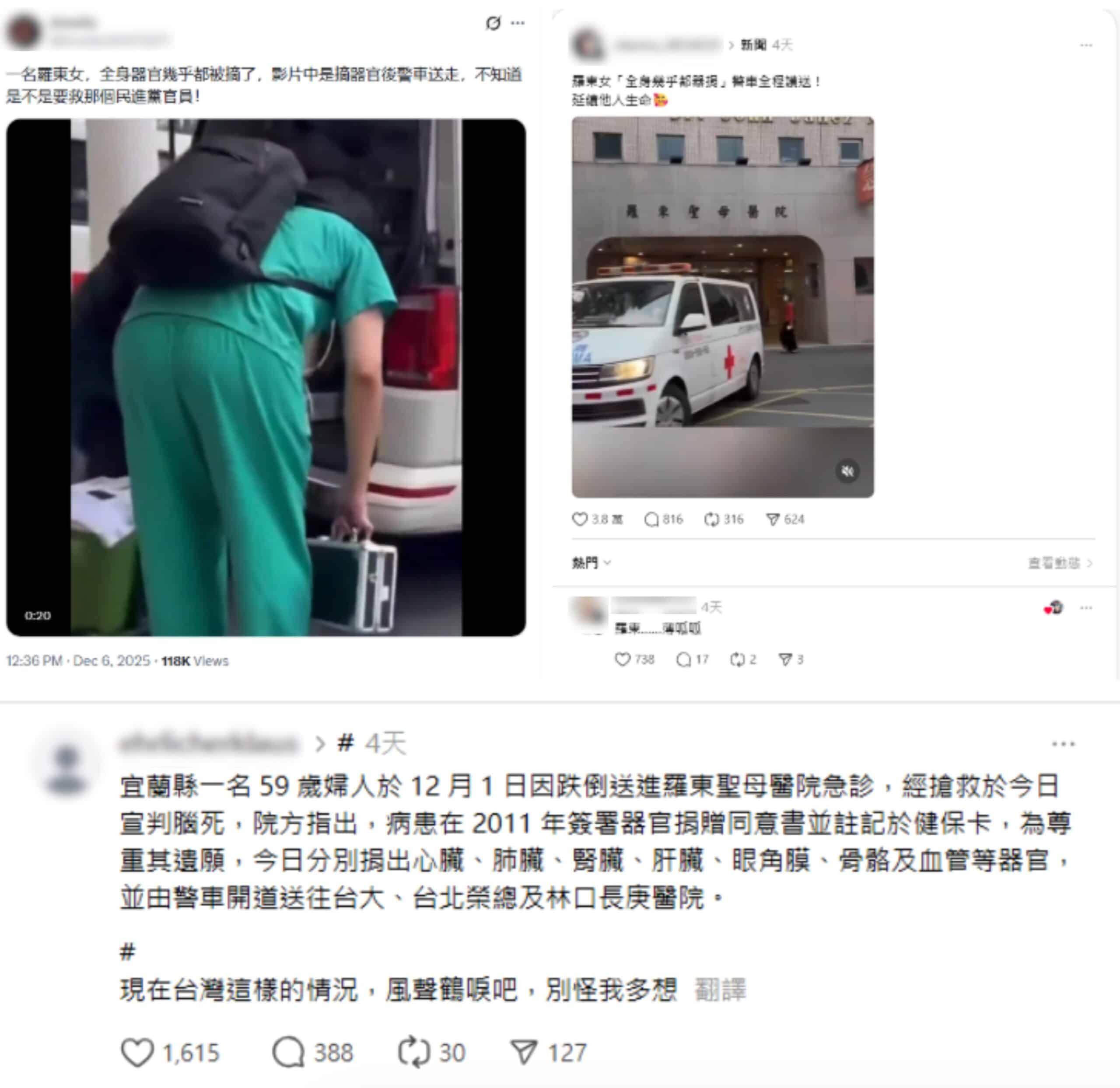 近日社群平台X有傳言宣稱「一名羅東女,全身器官幾乎被摘了」,並引用一段醫療運送畫面,稱「不知道是不是要救哪個民進黨官員」。另在Threads平台,也有貼文引用相關醫療畫面,並稱「羅東女全身幾乎都器捐,警車全程護送」;貼文底下則出現留言:「羅東…薄呱呱」、「那是活體時捐贈器官」、「提醒大家千萬不要簽捐贈器官唷!YT搜尋:國有器官」等論述。
