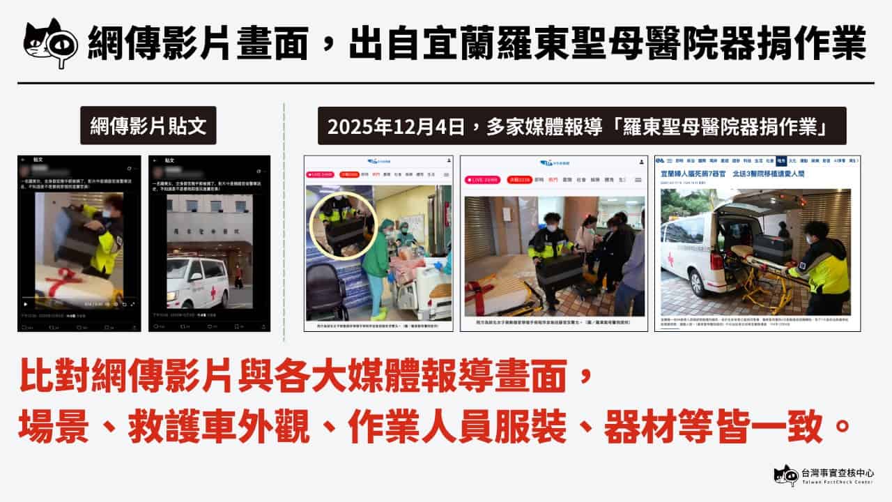 經比對,網傳影片與媒體報導羅東聖母醫院器捐事件影像一致,為同一事件(台灣事實查核中心製圖)