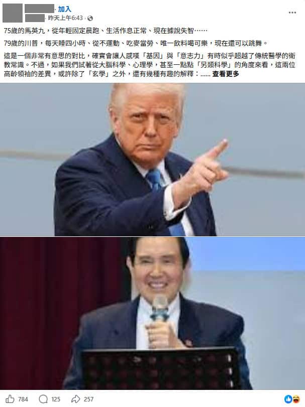 台灣政壇傳出前總統馬英九記憶力退化等消息,近日社群平台熱傳一篇文章,文中比較馬英九與美國總統川普的生活型態、性格等,聲稱川普鬥爭欲望強烈、常與人爭論,可以強迫細胞保持活性,馬英九規律的生活習慣則讓大腦無法接收新刺激;傳言也提到,川普享受速食與可樂,可以降低壓力荷爾蒙,馬英九長年慢跑,反而對大腦造成潛在的壓力等。