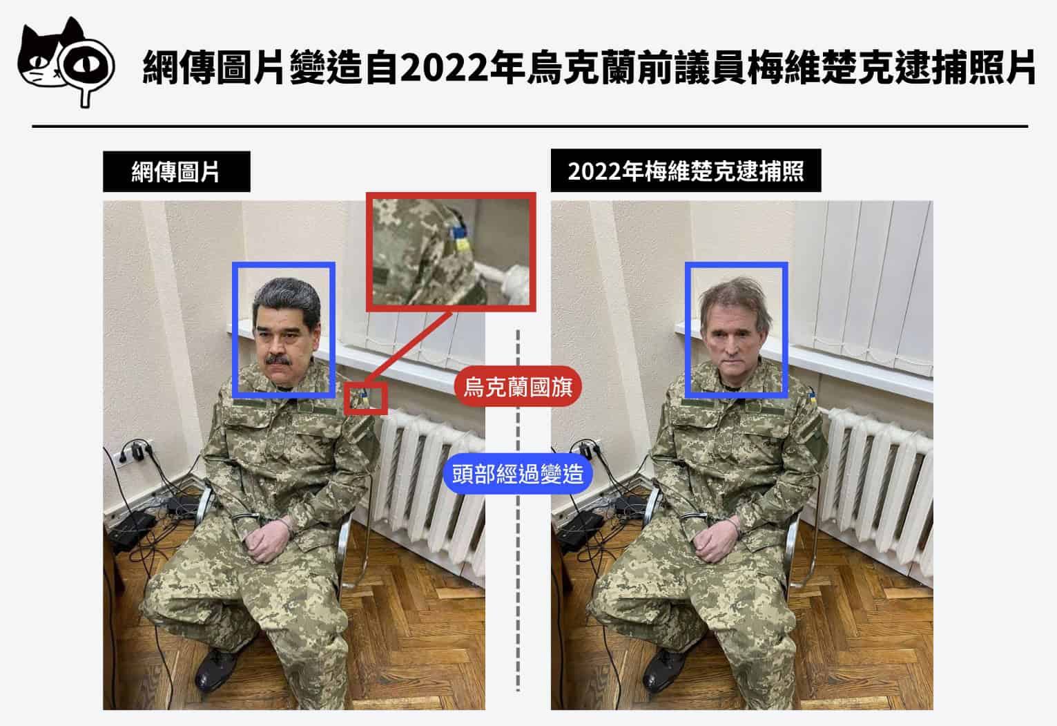 一、經圖片反搜,網傳圖片應是變造2022年4月親俄派烏克蘭前議員梅維楚克被逮捕的照片。比對發現,網傳圖片將梅維楚克的頭部替換為馬杜洛,其餘包括迷彩服款式、坐姿、背景牆面及藍色手銬等細節完全一致。