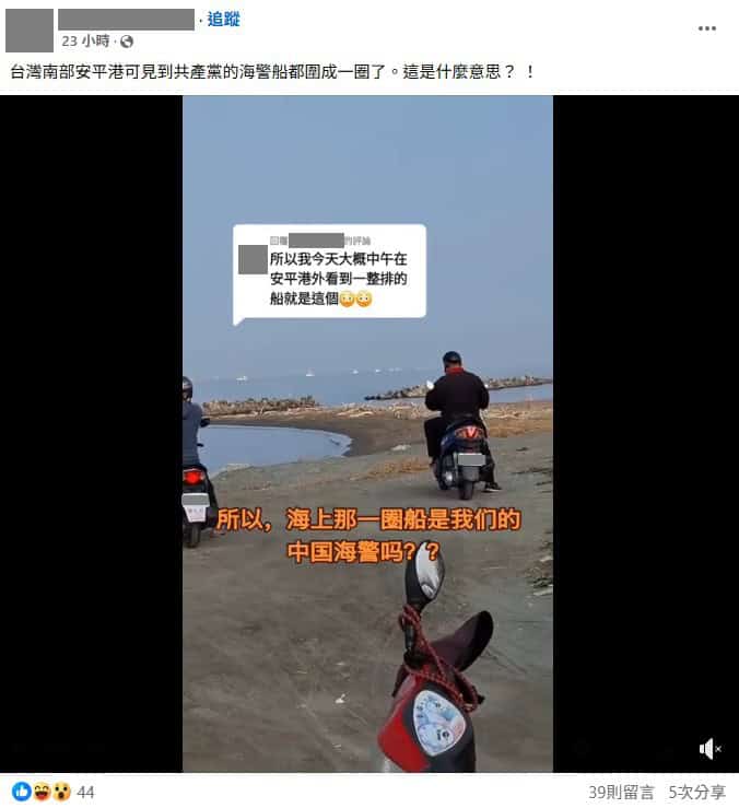 近日社群平台流傳一段影片,稱在安平港可見到中國海警船圍成一圈巡查,也有人質問國軍飛彈部隊是否該鎖定這種侵門踏戶的行為。