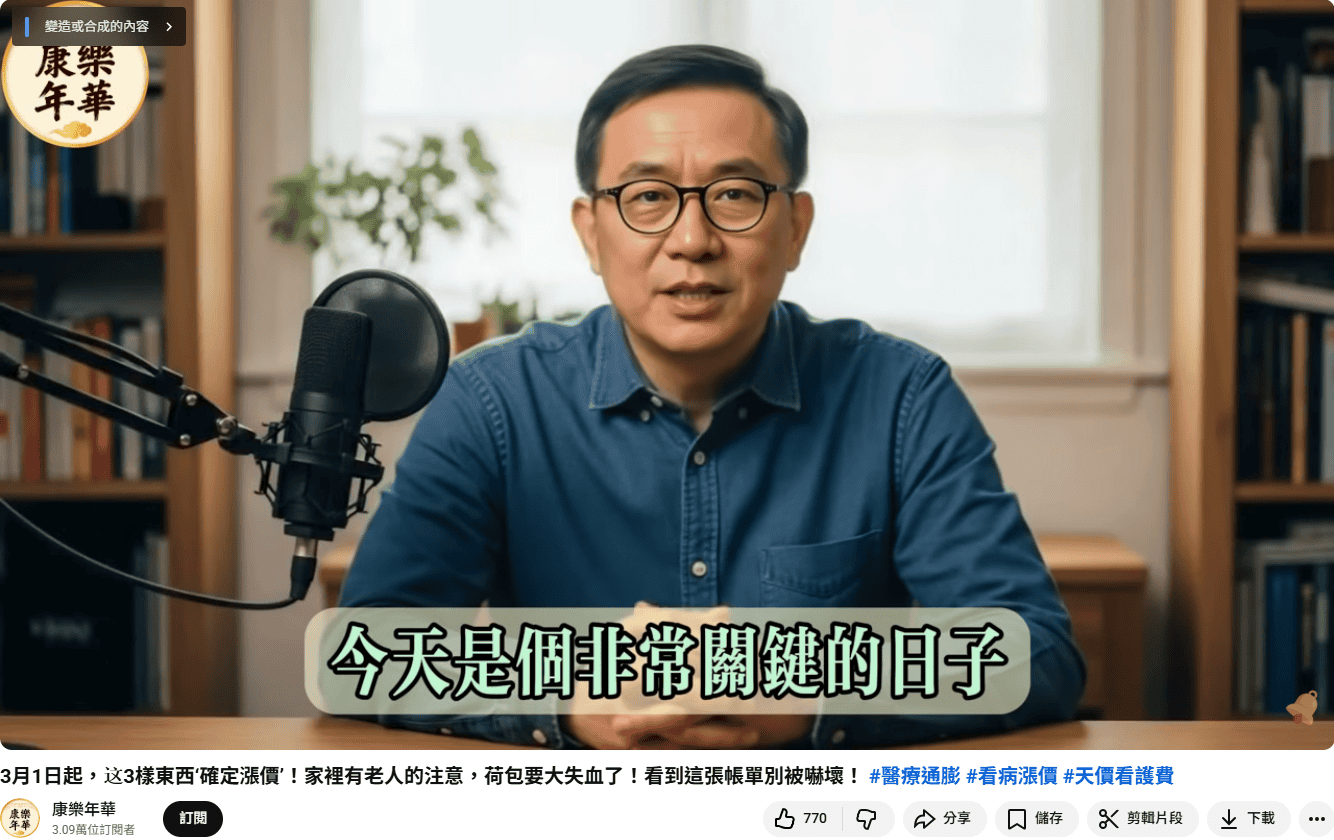 近期網路流傳影片稱2026年3月起新制上路,多項醫療費用將調漲;經查證,網傳影片為AI生成的內容農場影片,內容混淆舊制與未定政策,是缺乏可信度的不實資訊。