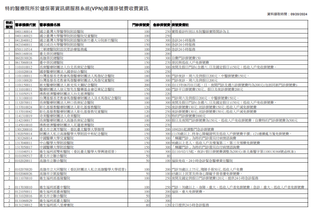 根據醫事司公布的醫療機構掛號費收費資訊也可發現,2024年3月取消掛號費上限後,大多數醫療院所的門診掛號費都還是維持在300元以下,並無網傳影片宣稱「已調高到300-500元」之情形。