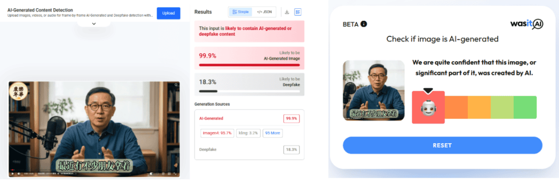 進一步運用Hive Moderation、Was it AI等線上AI偵測工具檢測網傳影片,也可發現網傳影片有極高機率為AI生成,並非真實影像。