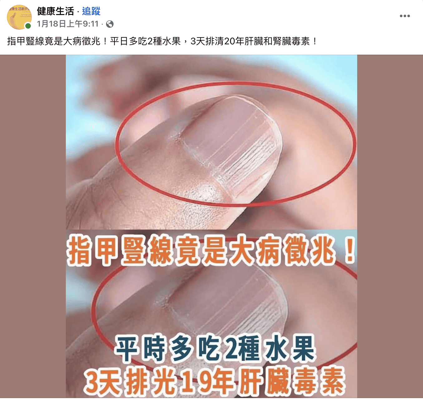 近期社群有傳言宣稱,指甲出現豎線是大病徵兆,只要平日多吃2種水果,3天就可排清20年肝臟和腎臟毒素。經查,網傳圖片是指甲正常的老化現象,不是大病徵兆。營養師也指出,目前沒有研究證實食用某一種食物就能保護腎臟或改善腎功能。