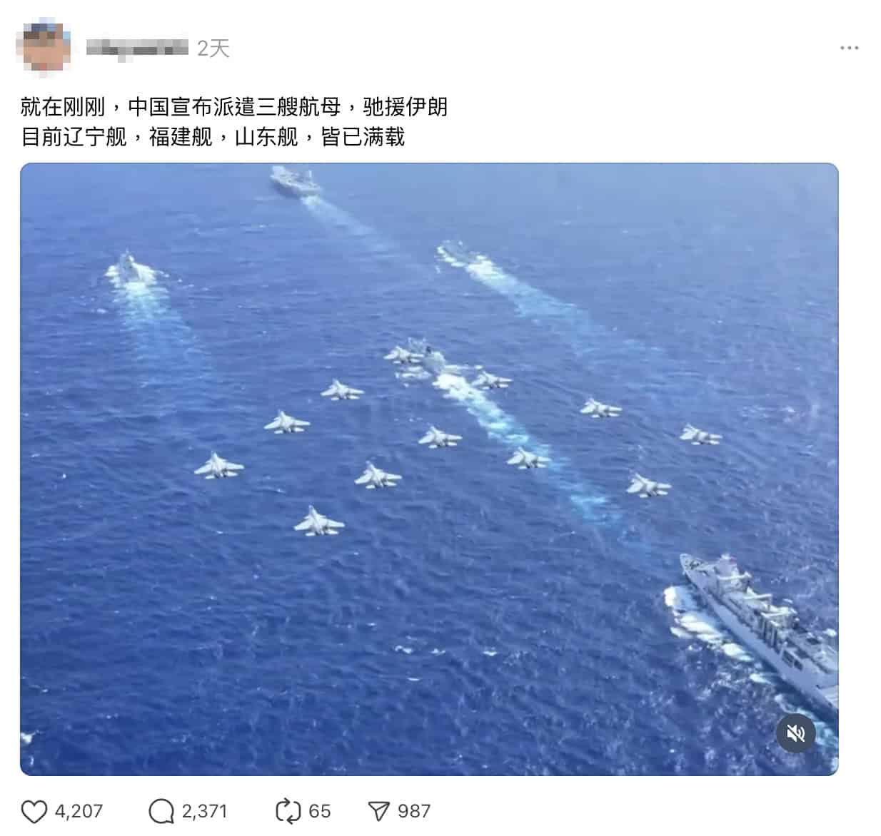 美國和以色列2月28日聯手襲擊伊朗,網路流傳一段中國出動戰機和航艦的影片,聲稱「中國宣布派遣3艘航母,馳援伊朗」,且出動的遼寧艦、福建艦、山東艦皆已滿載。