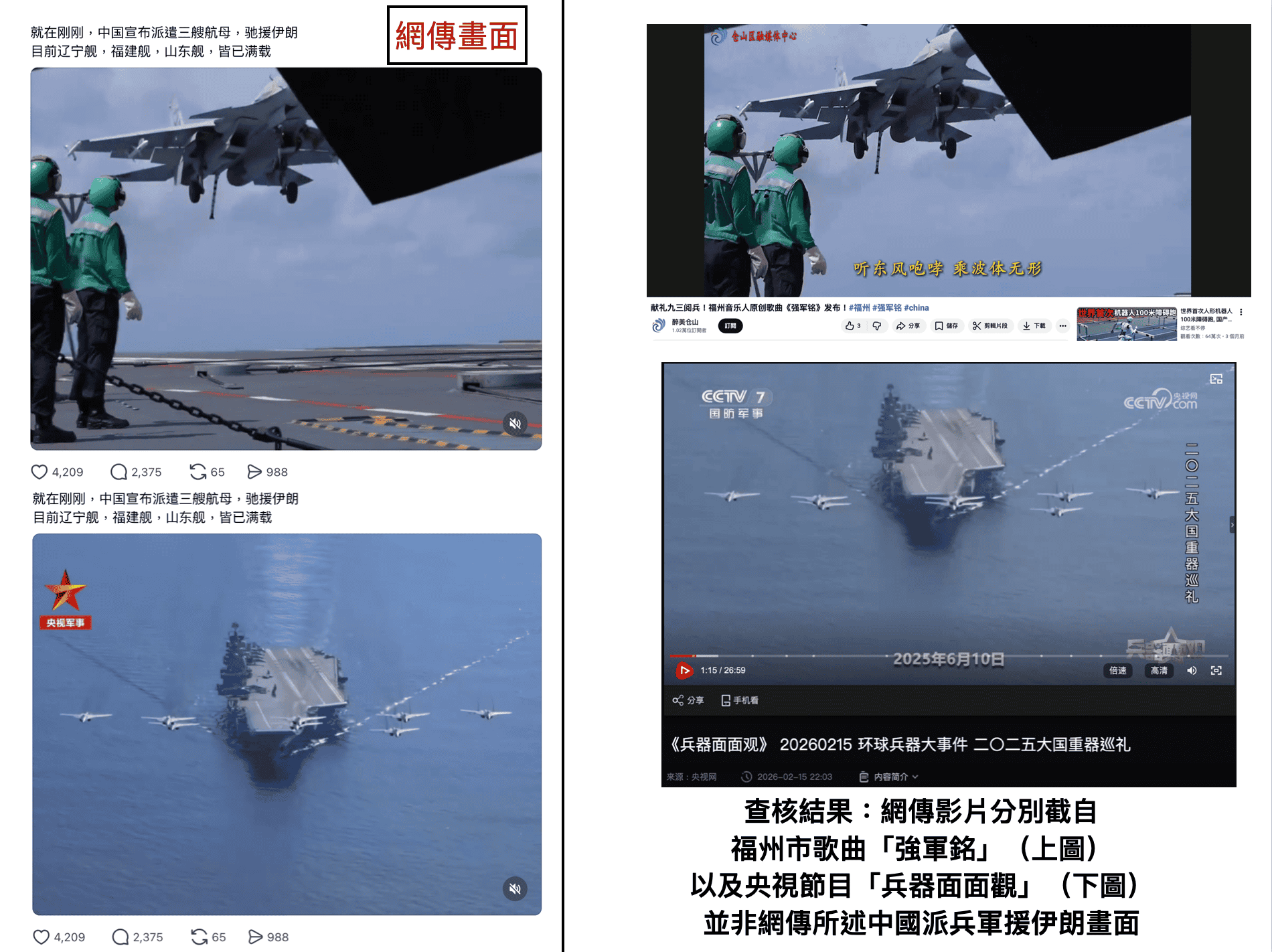 一、網傳影片為中國央視軍事紀錄節目「兵器面面觀」、中國福州市歌曲「強軍銘」MV影像,兩者畫面雖有中共戰機、航艦,但時間點皆是2025年間,時間點與近期美以伊戰爭不符。