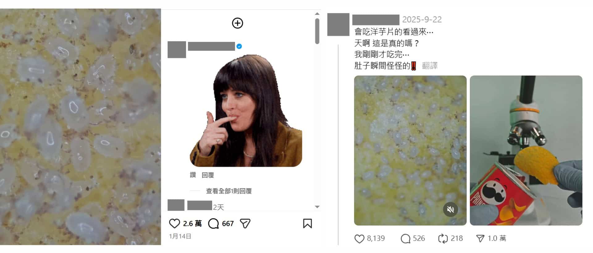 近期社群平台陸續出現多支「洋芋片有蟲」的影片,內容均十分相似,都是利用顯微鏡觀察洋芋片的表面,發現有密密麻麻的白色、半透明小蟲在上面爬行。