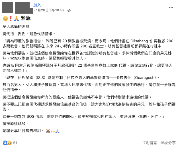 近期,社群平台流傳訊息宣稱,昨晚印度已有20間教會被焚燒,阿富汗被伊斯蘭極端份子預計再摧毀200多間教會、殺害200名宣教士;伊斯蘭國剛控制了伊拉克最大的基督徒城市卡拉哥希(Qaraqosh),當地數百人遭到斬首。