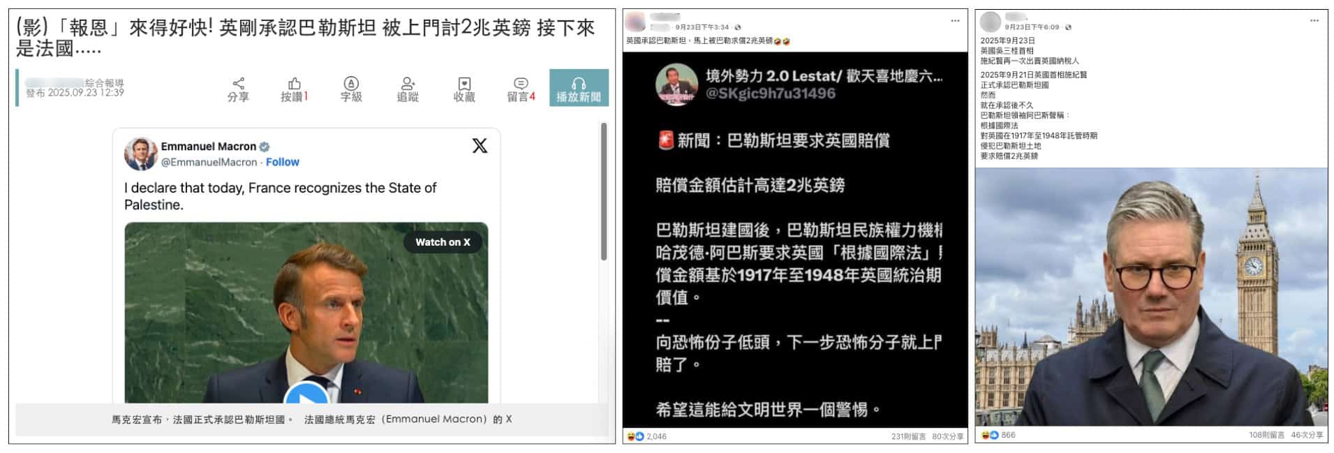 隨後社群平台流傳訊息稱「英國承認巴勒斯坦,馬上被巴勒斯坦求償2兆英磅」。另有台灣媒體報導聲稱,巴勒斯坦自治政府領導者阿巴斯(Mahmoud Abbas)要求英國以「依國際法支付賠償」,賠償金額恐超過2兆英鎊。