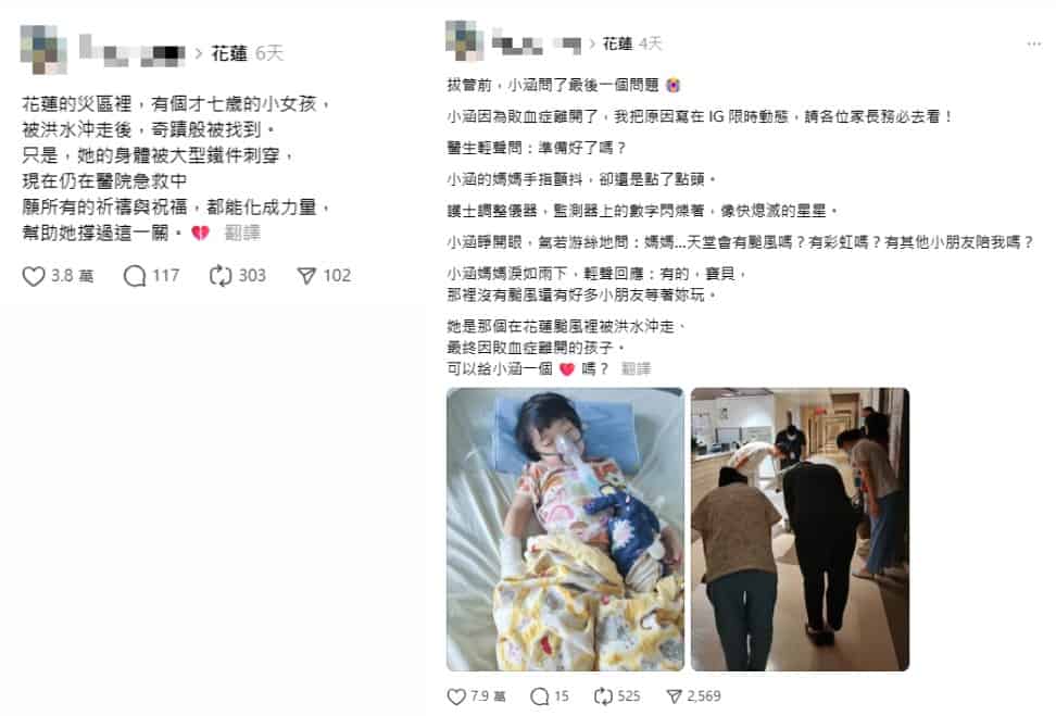 10月6日起,社群平台Threads有個自稱護理師的用戶發文稱,花蓮災區有個7歲小女孩被洪水沖走後奇蹟獲救,但身體被大型鐵件刺穿,仍在醫院急救中,希望網友幫忙祈禱祝福;10月8日,該用戶再度發文,並附上兒童躺在病床上的照片,聲稱先前被洪水沖走受傷的女童,因傷口感染導致敗血症而離世,吸引近8萬名網友點愛心、超過2500次分享。