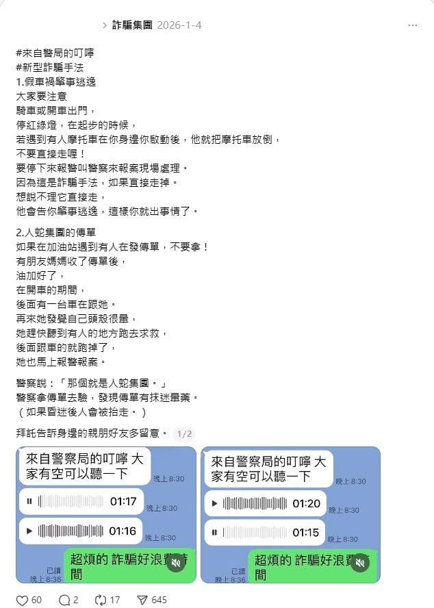 近期通訊軟體與社群平台頻繁流傳兩則以台語錄製的語音訊息。一則警告駕駛人留意「新型詐騙」手法,宣稱有不法分子會趁車輛綠燈起步時,在車旁假裝摔倒(碰瓷),若駕駛人以為無擦撞而直接駛離,將被對方控告「肇事逃逸」索賠,呼籲民眾務必報警處理。