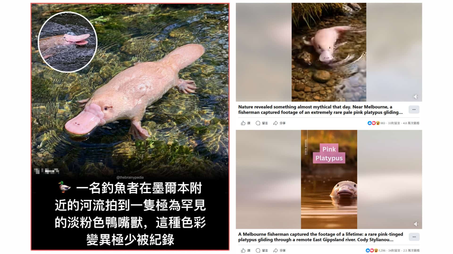 近日網路熱傳一張「粉紅色鴨嘴獸」圖卡,聲稱有釣客在澳洲墨爾本附近河流拍到一隻極罕見的淡粉色鴨嘴獸。圖卡左上角的白色小圓圈內有一張鴨嘴獸在水中的局部側面影像,大圖則是粉紅色鴨嘴獸全身影像。另外,社群平台也有流傳兩段粉紅色鴨嘴獸影片。