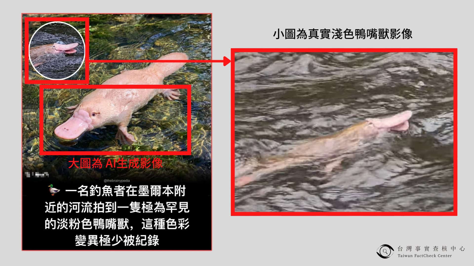 網傳「粉紅色鴨嘴獸」圖卡中,左上角小圖為真實影像,大圖則是與AI生成,因此,網傳圖卡為「部分錯誤」訊息。