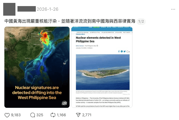 近期社群平台流傳訊息宣稱,中國黃海出現嚴重核能汙染,並隨著洋流流到南中國海與西菲律賓海。