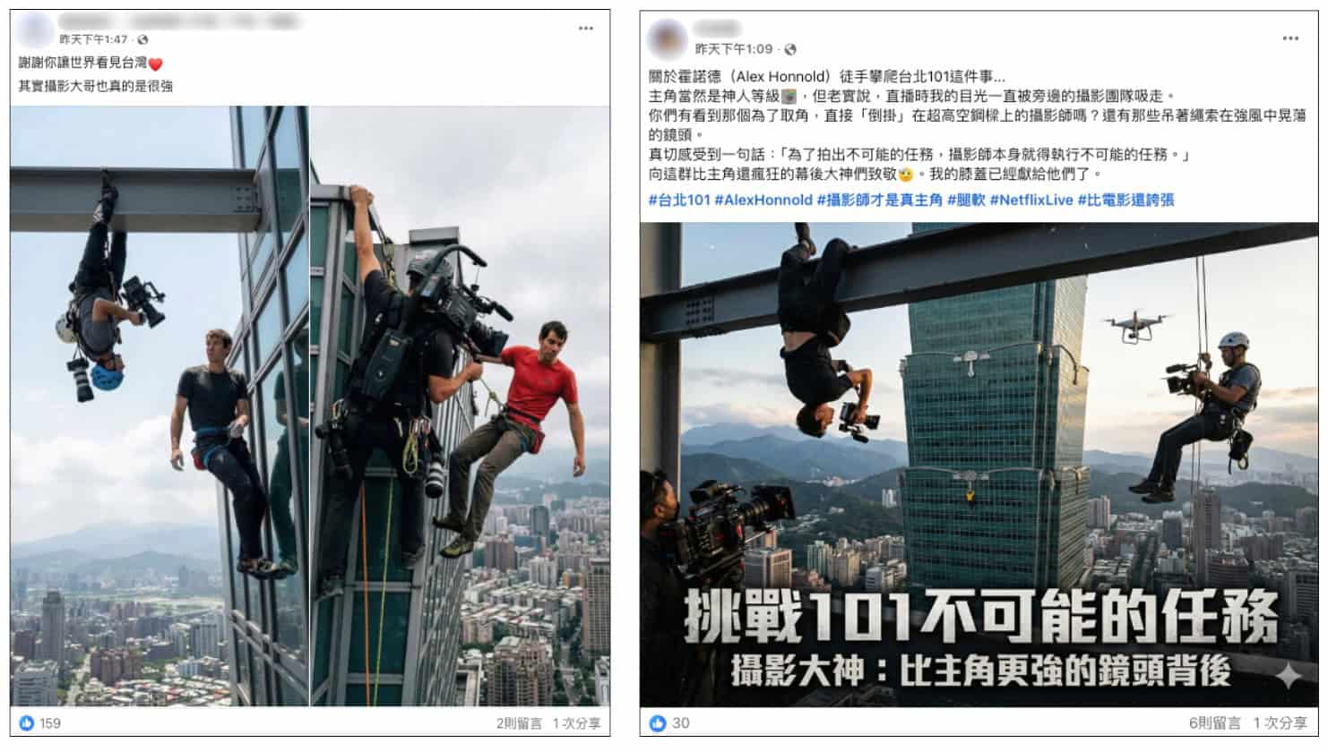 隨後社群平台流傳3張圖片,聲稱是拍攝霍諾德的攝影師。其中有兩張圖片顯示,拍攝霍諾德的攝影師倒吊在高空鋼樑進行錄影;而有另外一張圖片則顯示,攝影師一手抓著台北101大樓,另一手扛著攝影機進行拍攝。