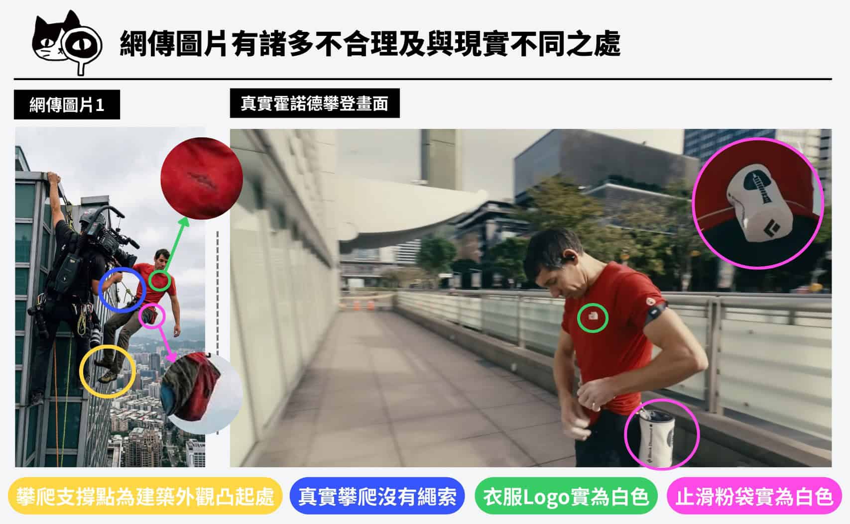 一、網傳圖片出現多個不合理之處:如霍諾德實際上為無繩徒手攀登、且踩踏於大樓建築外觀的凸起結構作為支點;但圖片卻繫著繩索、踩踏在大樓玻璃上。網傳圖片中霍諾德的衣服顏色及止滑粉袋的顏色與樣式,也與現實情況不同。