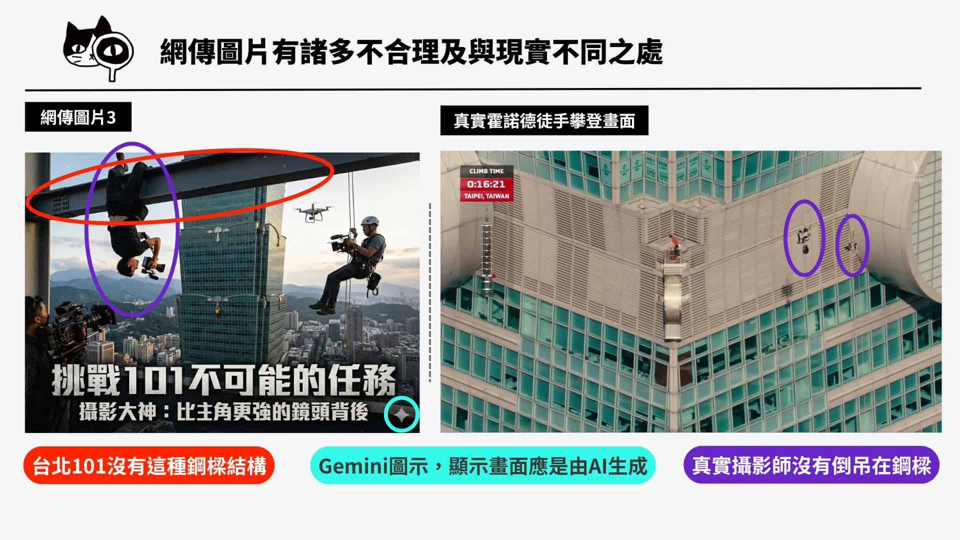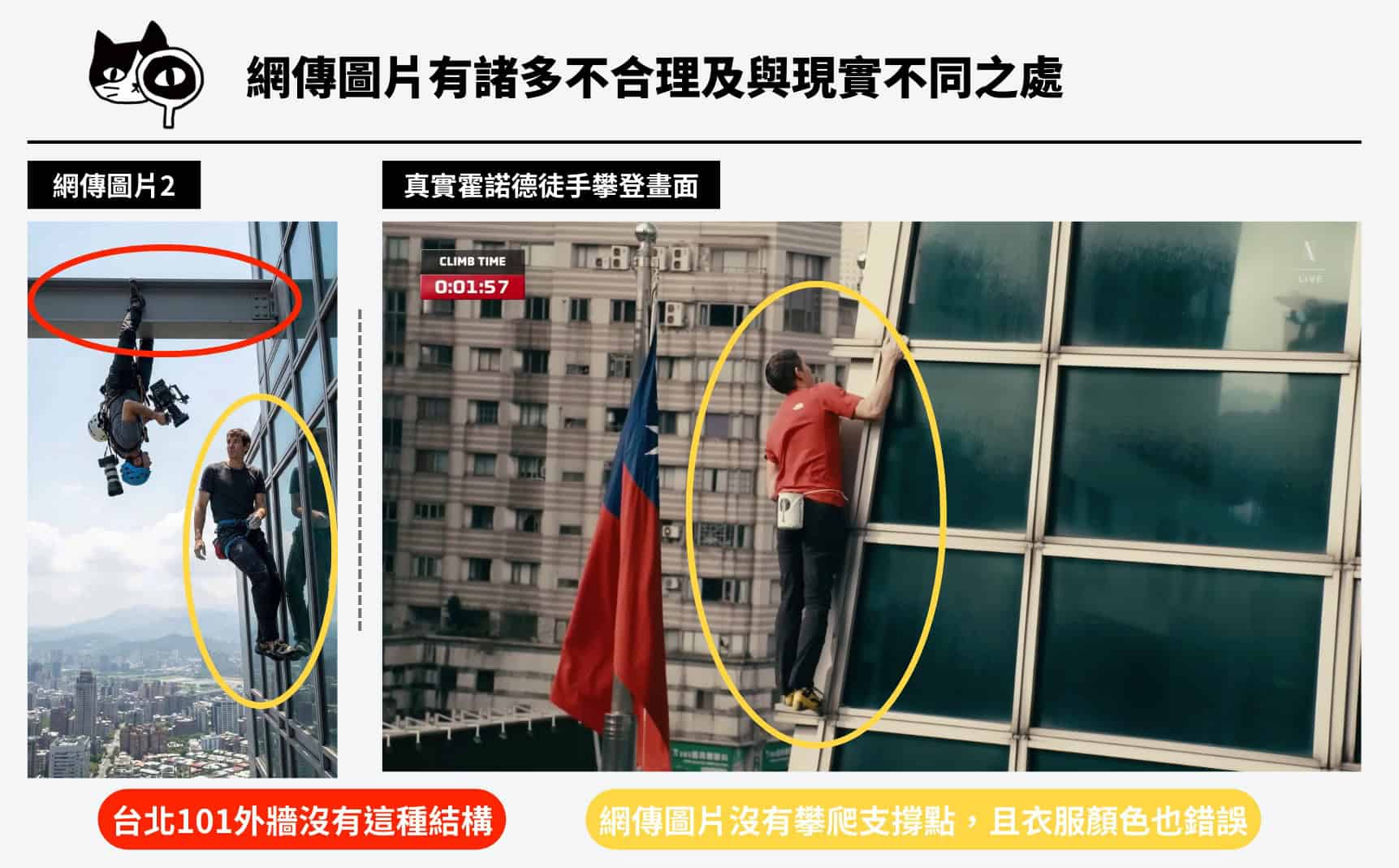 圖片1及圖片2出現霍諾德都直接站立於玻璃上,且圖片2霍諾德身上還出現繩索,與真實情況明顯不符。進一步比對兩張圖片中的衣服及裝備細節,真實霍諾德當日身著胸口印有白色Logo的紅色T恤,網傳圖片卻出現黑色T恤、或是紅色T恤但胸口Logo為黑色,都可知網傳圖片應非真實照片。圖片2與圖片3還顯示攝影師倒吊在鋼樑上,但台北101大樓並沒有這種鋼樑結構。