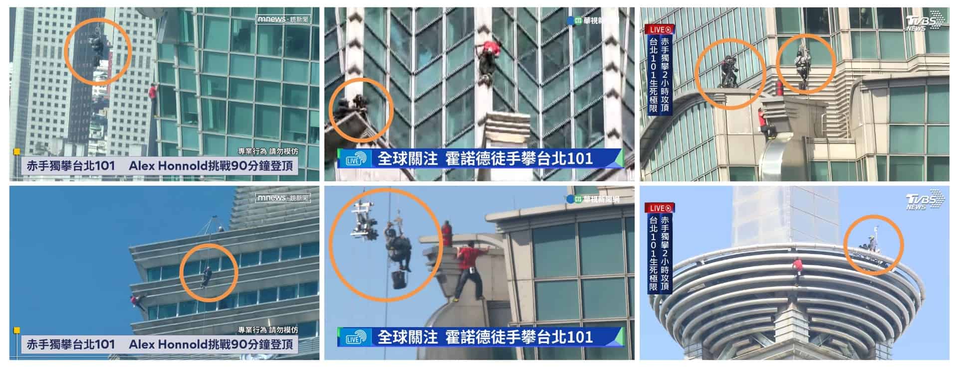 綜合以上畫面,可知近距離拍攝霍諾德的攝影師,主要採兩種方式進行作業:一、透過高空吊掛系統,以繩索固定並拉動攝影師至適當高度拍攝;二、於建築物裡可短暫停留的平台空間中上進行拍攝。沒有出現網傳圖片所稱的「攝影師一手抓握建築物,一手扛起攝影機」的拍攝畫面,台北101外觀也沒有出現網傳圖片中的鋼樑樣式,傳言畫面內容與實際情況明顯不符。