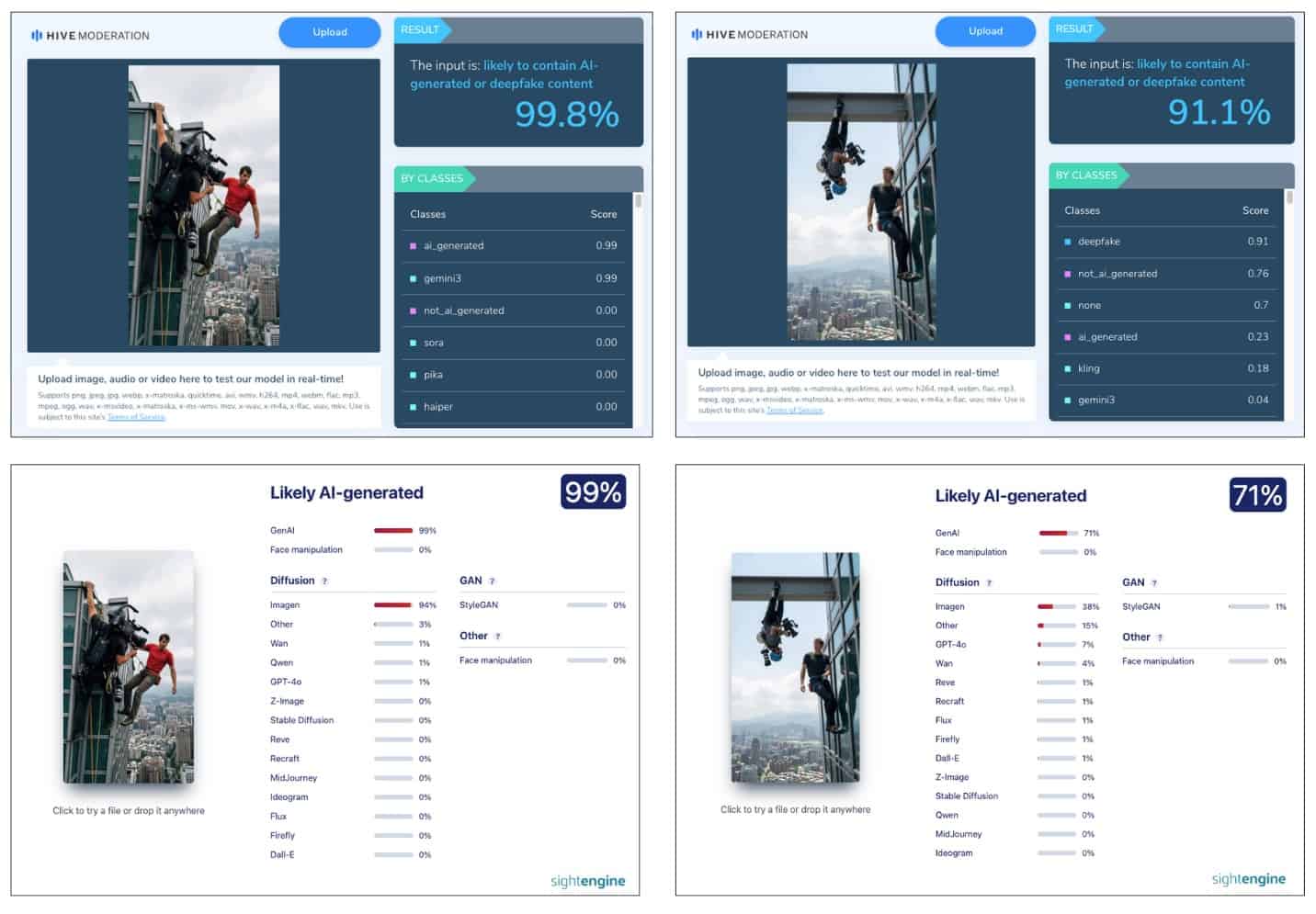 透過AI生成影像檢測工具《Hive Morderation》、《sightengine》分析,檢測結果均顯示該些片段有高機率為AI生成內容。