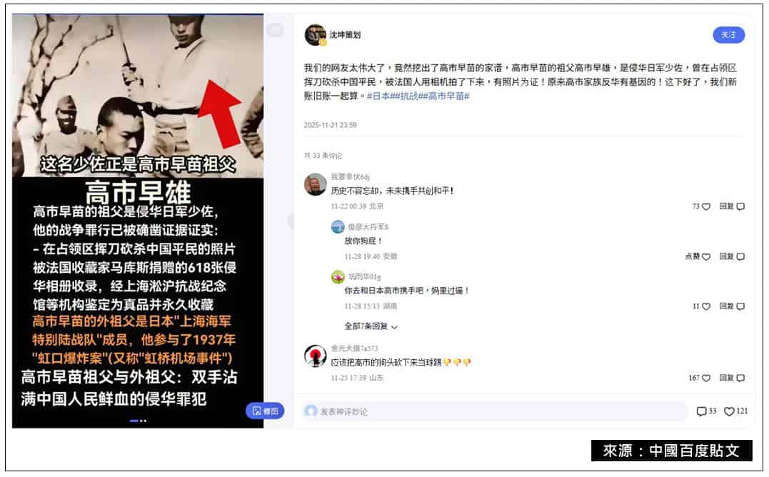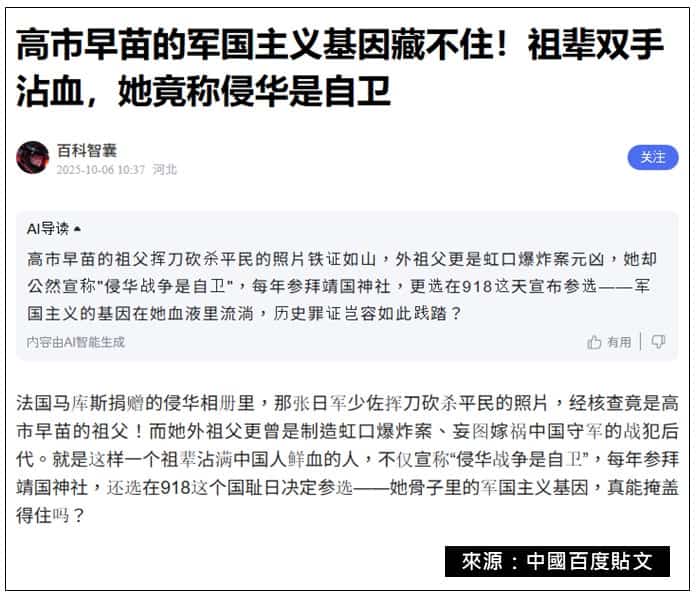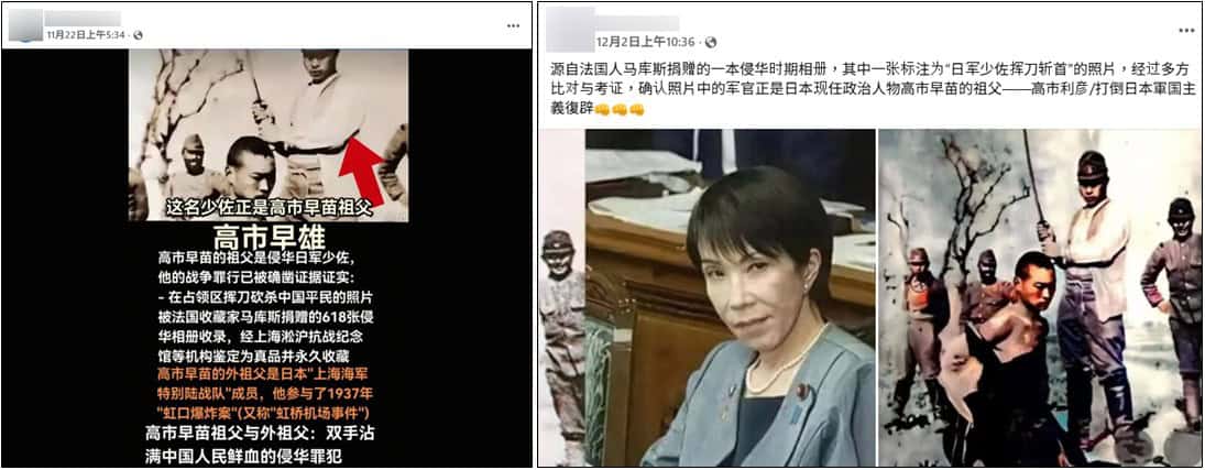日本首相高市早苗11月初在國會「台灣有事」說法,引發中日兩國關係緊張。近期流傳一張圖卡,以簡體字說明高市早苗祖父為侵華日軍少佐高市早雄,並附上一張日軍持刀準備砍向下跪民眾的照片。也有其他傳言版本稱高市早苗祖父為高市利彥。