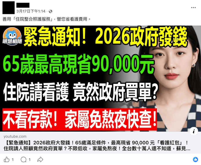 網傳影片以AI生成,夾雜大量錯誤資訊,虛構2026有針對長者的看護紅包政策,為容易引人誤解的錯誤訊息。