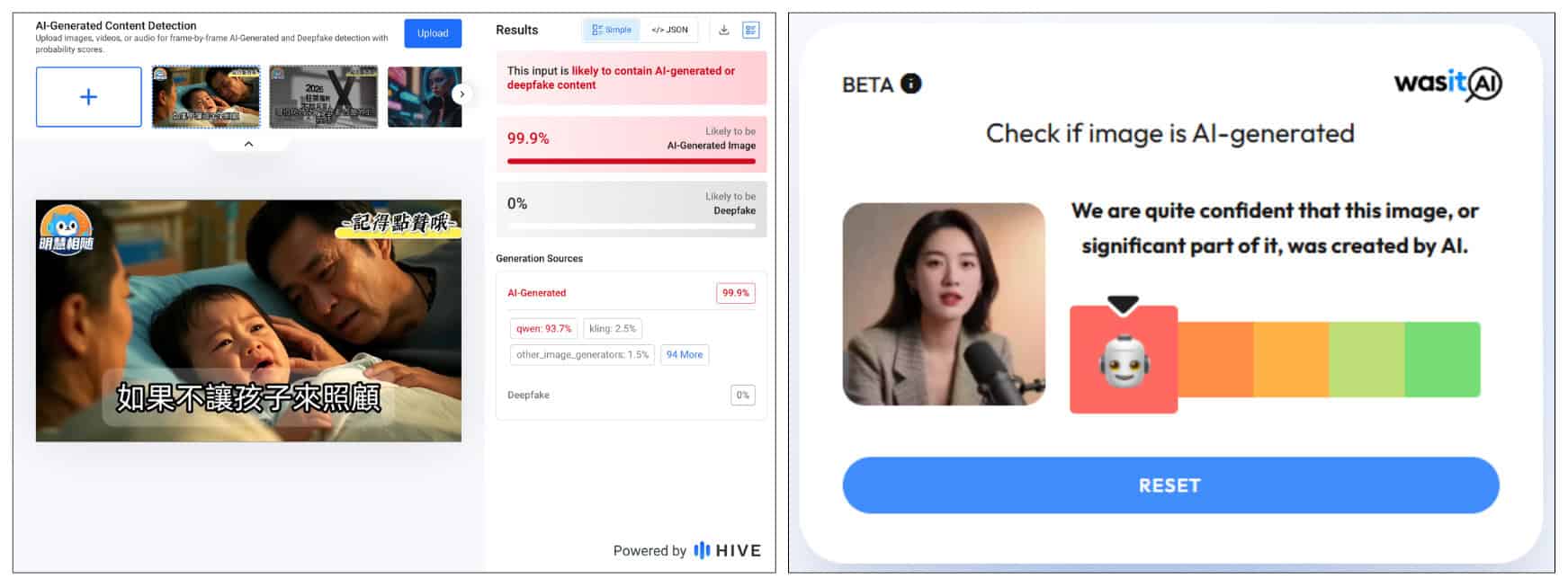 利用AI生成影像偵測工具「Was it AI」、「Hive Moderation」進行檢測,檢測結果顯示畫面有極高的可能為AI生成。
