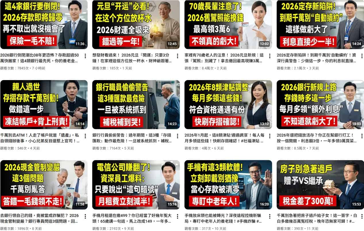 過去一年來,YouTube平台上同樣類型的頻道如雨後春筍般大量出現,大量發布「健保卡背後藏黃金密碼」、「65歲以上手機月租費隱藏方案」、「2026年發放12000元禮金」、「銀行要統一定存利率」等夾帶錯誤內容或完全虛構捏造的AI生成影片,並不可信。