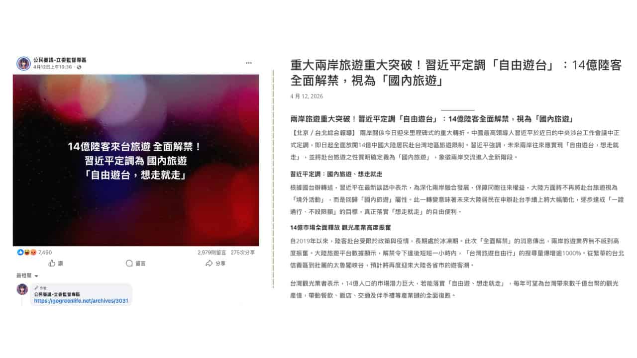 查核中心接到讀者申訴,聲稱社群流傳「14 億陸客來台旅遊全面解禁」,且習近平定調為國內旅遊,可以「自由遊台,想走就走」。這則訊息源自於臉書粉專「公民廟口 ~ 立委在做天在看」及「公民1985行動聯盟」,並於貼文留言處附上一則網站連結。