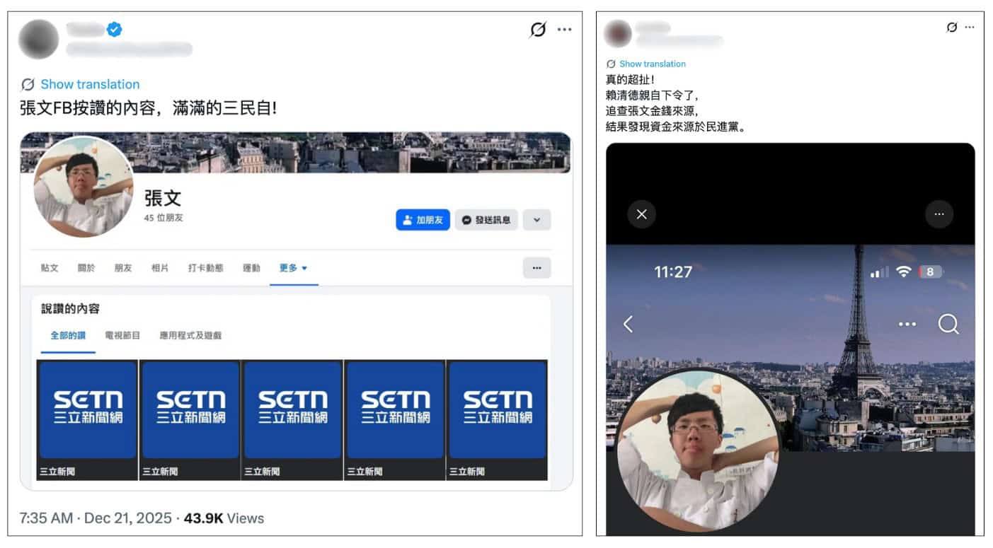 (一)疑似張文的臉書帳號最早由網紅「四叉貓」於12月20日揭露,隨後引發網路討論與媒體報導。查核記者實際檢視該帳號,在「更多」中的「說讚的內容」頁面,並未發現其按讚過三立或其他台灣媒體的臉書粉專。