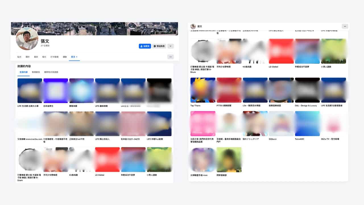 二、疑似張文的臉書帳號最早由網紅揭露。查核記者實際檢視該帳號,在「更多」中的「說讚的內容」頁面,並未發現其按讚過三立或其他台灣媒體的臉書粉專。