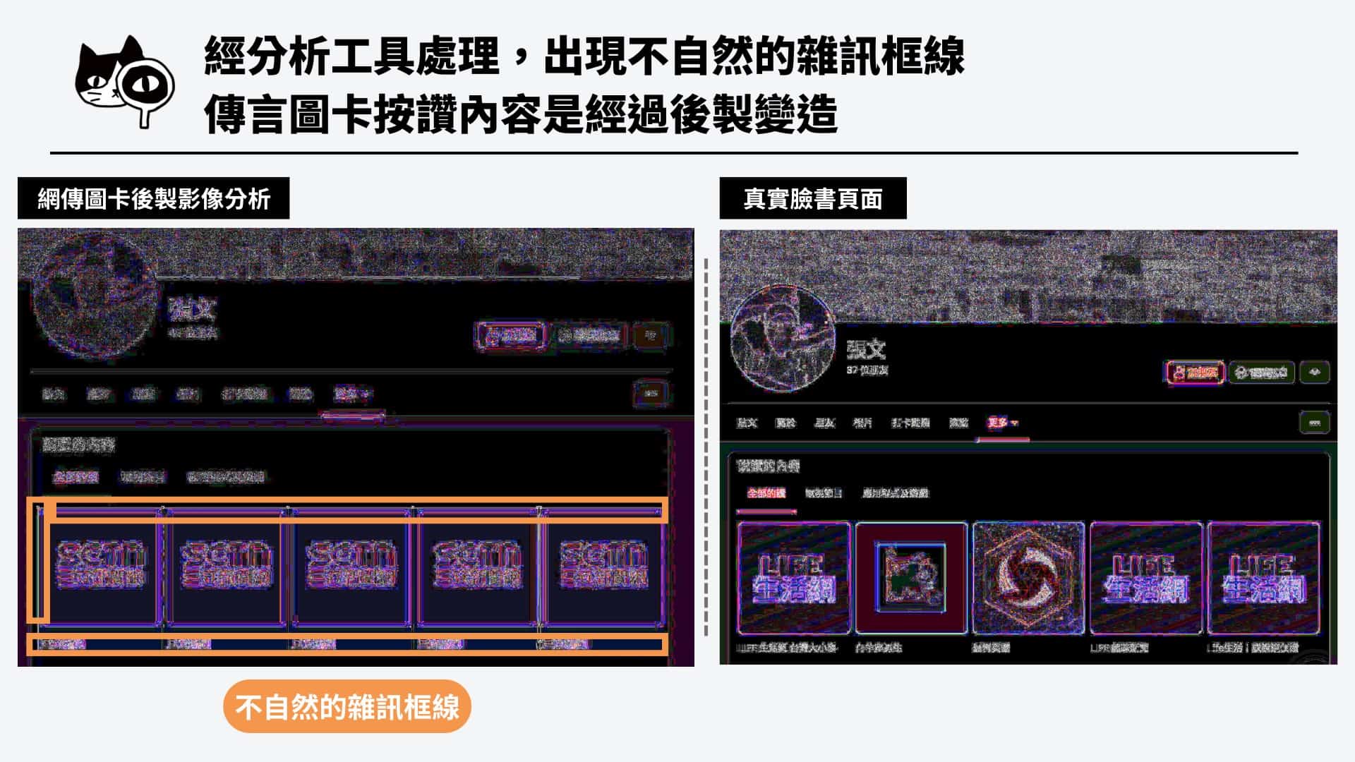 進一步使用經圖片分析工具檢測,網傳宣稱嫌犯按讚媒體粉專的擷圖,出現不自然的雜訊框線,證實該圖卡是經過後製變造,並非原始網頁畫面。