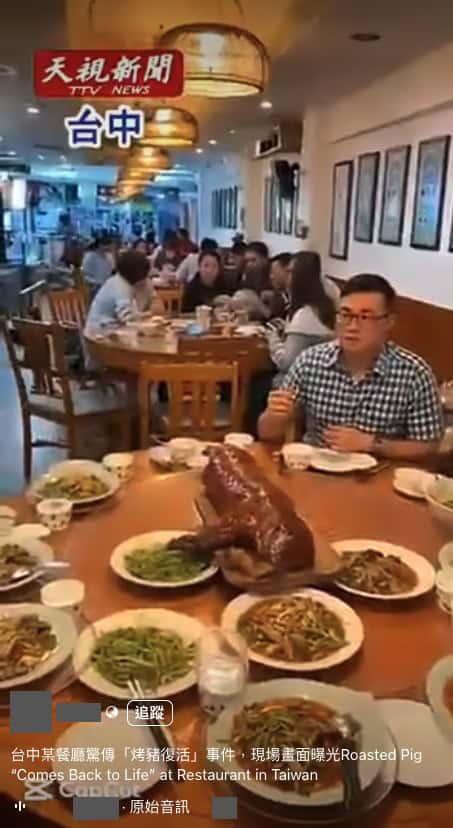 LINE社群和網路流傳影片宣稱「台中某餐廳驚傳『烤豬復活』事件」,內容顯示餐桌上的烤豬跳至桌子下方,影片旁白也模仿電視台報導說明全場客人嚇壞。